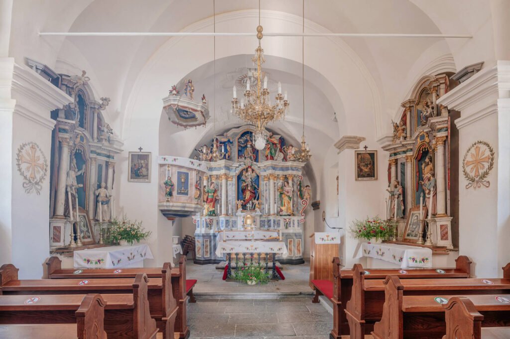 Kot priča letnica 1684, najdena na podstrešju prezbiterija, je bil takrat bržkone sočasno podaljšani in razširjeni ladji prizidan prezbiterij z banjasto štukiranim obokom. Z letnico1730 datiran lesen veliki oltar je rezultat več predelav. V tronu je baročen kip zavetnice Katarine Aleksandrijske z zobatim kolesom ob nogah, palmovo vejico v desnici in mečem v levici, obdajata jo kipa Lucije s pladnjem z očmi in Barbare s kelihom – torej so vse svetnice upodobljene s svojimi običajnimi atributi. V niši atike je kip sv. Florijana, ki ga obstopata apostola Peter in Pavel s knjigo v rokah. Stranska oltarja in prižnica so mlajši (1866).